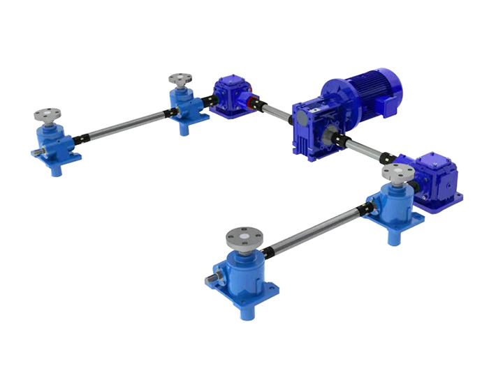 多臺聯動絲桿升降機平臺,電機在中間,電機連接轉向箱或者K系列減速機,在通過連接桿和···